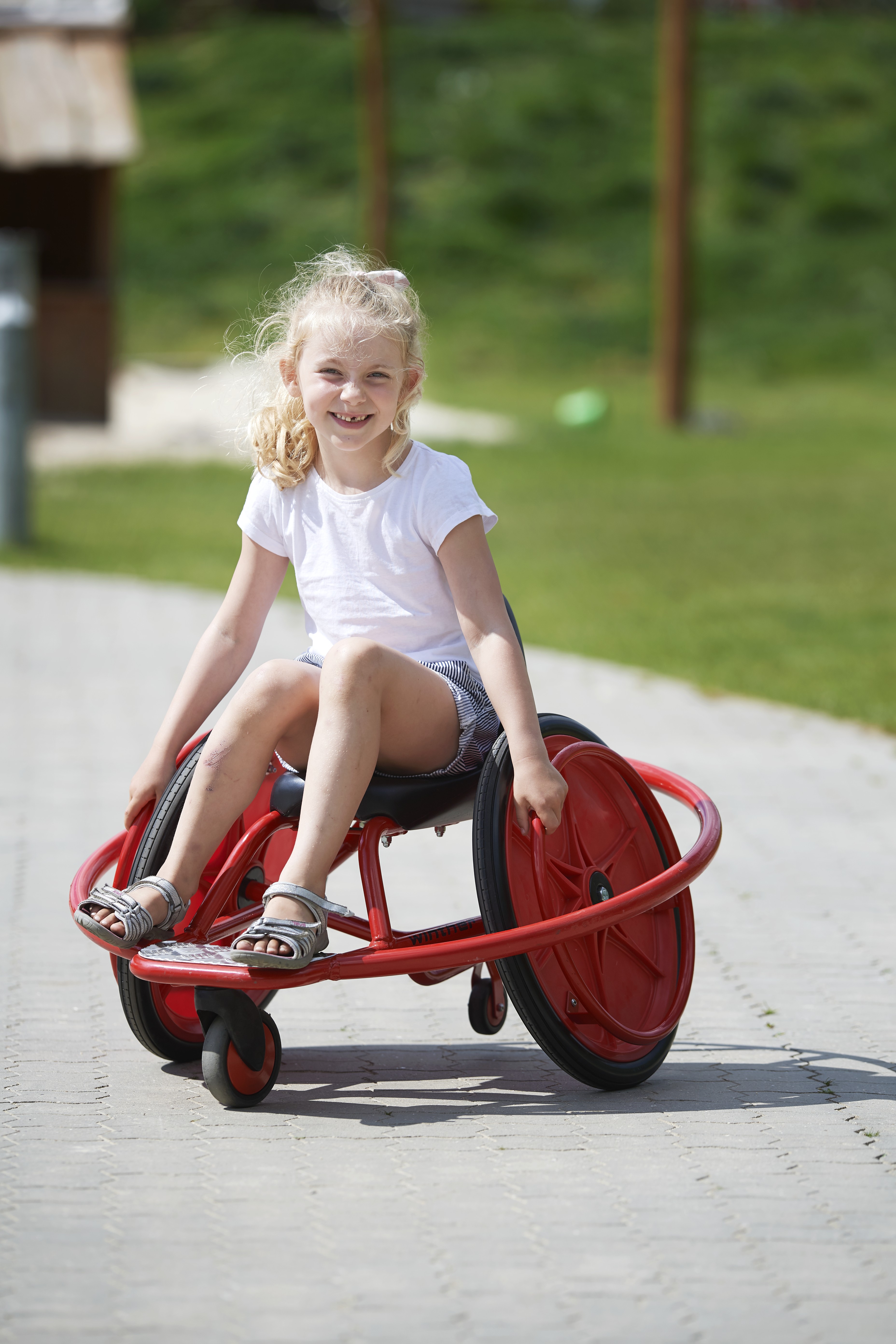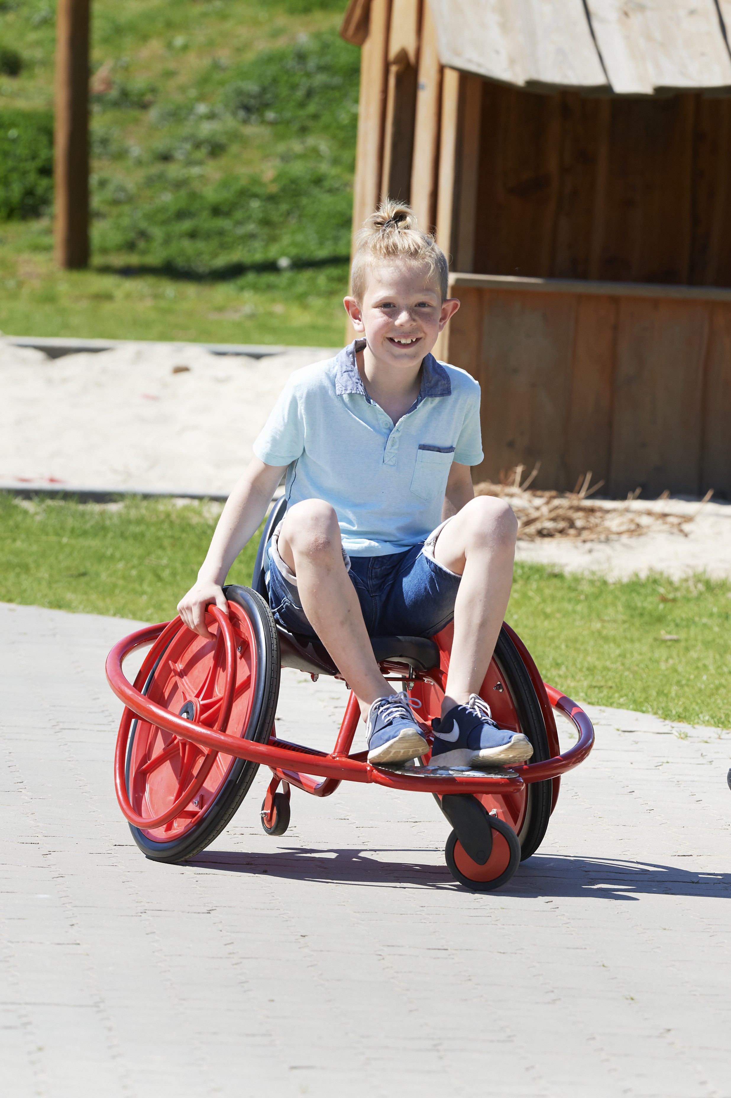The inclusive, internationally award-winning WheelyRider is a playful fusion between a utility wheelchair and a manually powered go-cart, with form and proportions designed to invite activity and shared play. Movement defines the object and shapes how it is approached, used, and understood on the playground. WheelyRider is part of the Viking Challenge series of playground equipment, which not only spreads joy on the playground but also develops children's coordination skills.